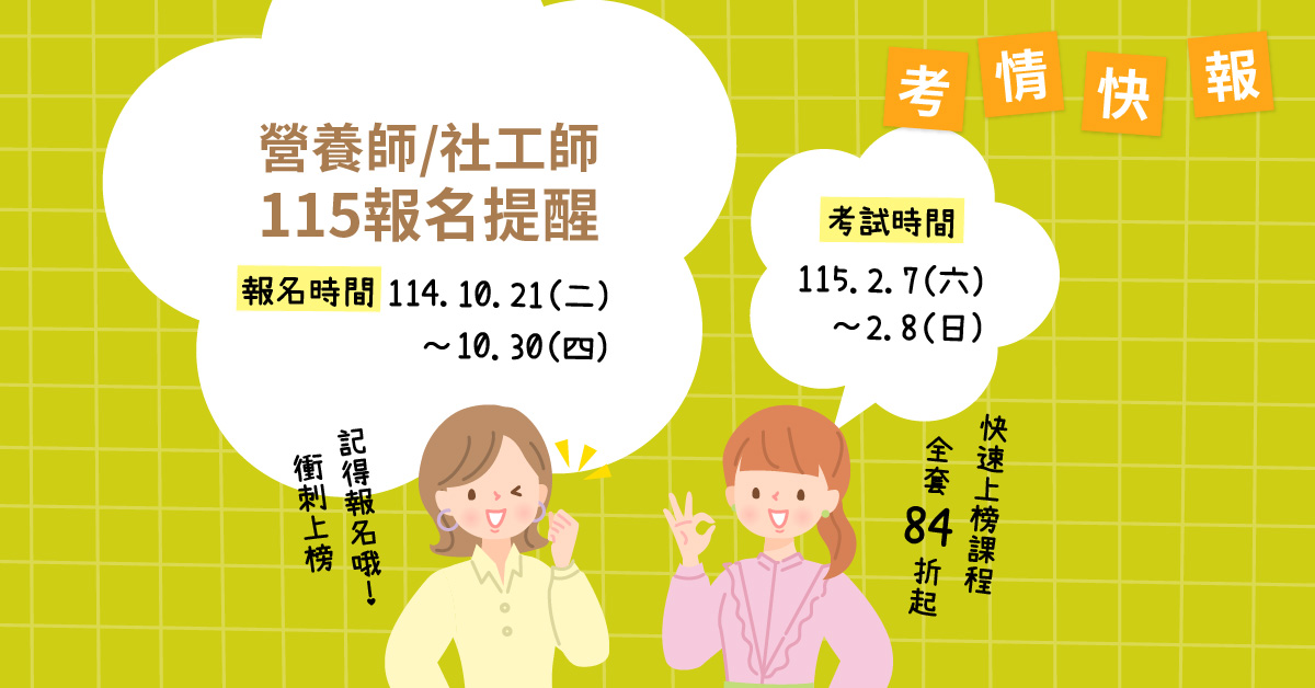「台中志聖補習班推出 115年度營養師新班──雙循環×雙師資教學模式,呂佩諭老師帶領生物化學、營養學,常瑛老師破解公共衛生/食品安全。線上雲端課程,助你一次上榜!」