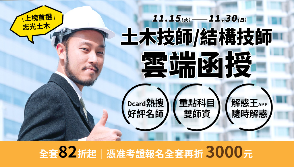 面授×雙效×雲端 11/30前回饋限定-全套限時82折起 全套85折|單科82折 專技高考-115土木技師專班 ※憑『土木相關在職證明』,報名土木技師-正規全套享購物車當下優惠折扣後再折1,000。